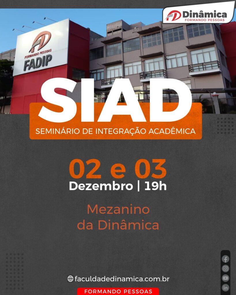 O Simpósio de Integração Acadêmica (SIAD) do segundo semestre de 2025 será realizado nesta terça (2) e quarta (3), no Mezanino da Dinâmica. O evento tem como objetivo a apresentação dos trabalhos de cada turma dos cursos de graduação na disciplina Práticas Extensionistas.