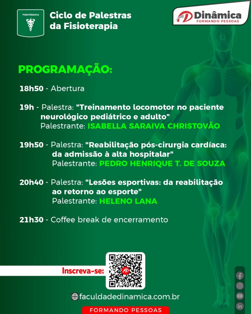 A coordenação do curso preparou uma programação especial para uma noite de muito aprendizado com profissionais renomados que vão compartilhar conhecimentos valiosos sobre reabilitação, lesões esportivas e fisioterapia neurofuncional.