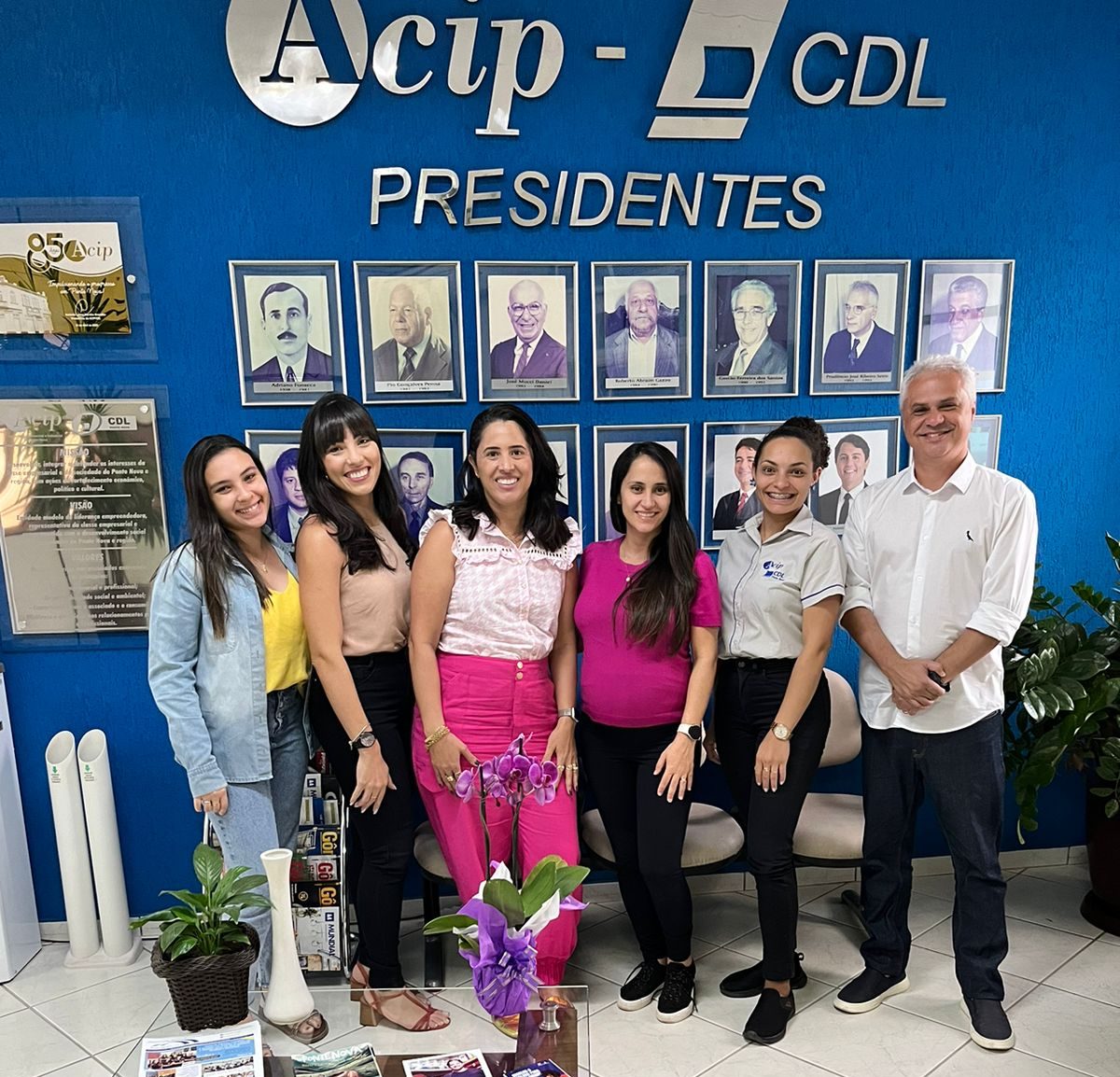 Na foto, estão os coordenadores da pesquisa: os professores Marcelo Mello, Desirré Moraes e Adriane Moreira; a gerente da ACIP, Regilane Neves; a aluna do Curso de Ciências Contábeis, coordenadora técnica do IPC Cesta Básica/PN e colaboradora da ACIP, Kelly Conegundes; e a aluna do 5º período do Curso de Nutrição Marcela Cheloni.