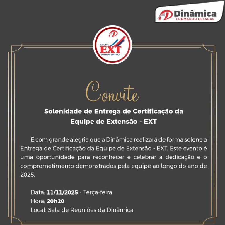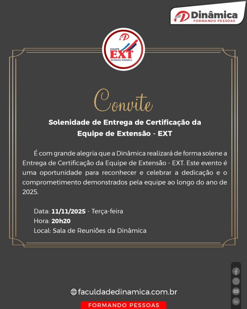 Depois de um ano de diversas atividades e ações concluídas pela Equipe de Extensão (EXT) da Faculdade Dinâmica, a instituição tem a honra de entregar os certificados de participação aos membros do grupo.