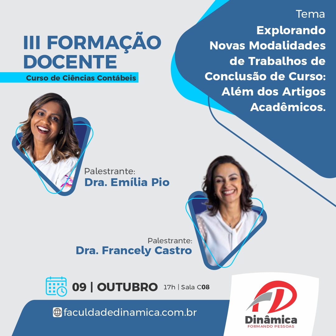 Para enriquecer esse debate, o Curso convidou as Professoras Dra. Francely Castro e Dra. Emília Pio, ambas do Curso de Fisioterapia, que possuem vasta experiência no uso de diferentes formatos de TCC em suas áreas. Elas vão compartilhar seus conhecimentos e discutir como essas novas modalidades podem ser aplicadas de maneira eficiente também no campo das Ciências Contábeis.