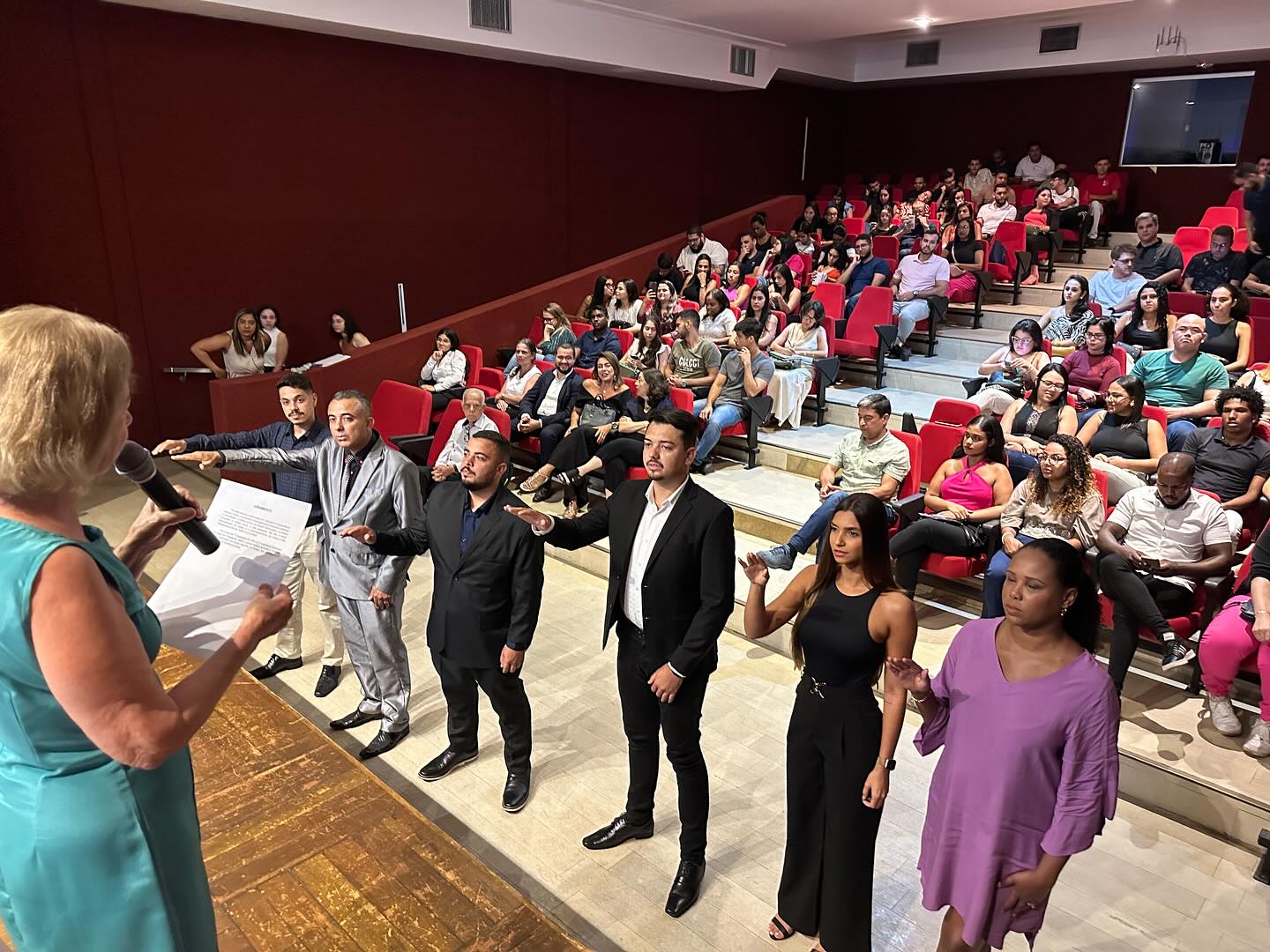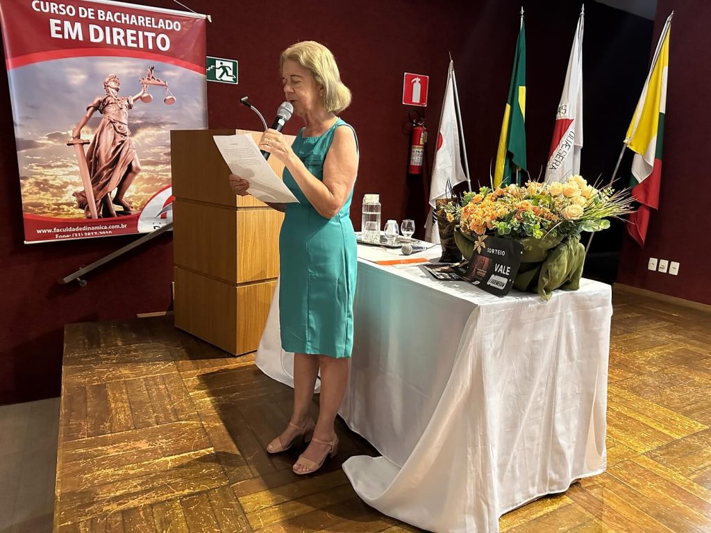 Em seguida, um momento especial de entrega de carteirinhas para os novos estagiários da OAB. A ilustríssima Dra. Maria da Glória Rodrigues Cunha Carneiro, presidente da 7ª Subseção da Ordem dos Advogados do Brasil, foi responsável pela entrega, parabenizando os estudantes pelo seu ingresso nessa importante etapa da carreira jurídica.