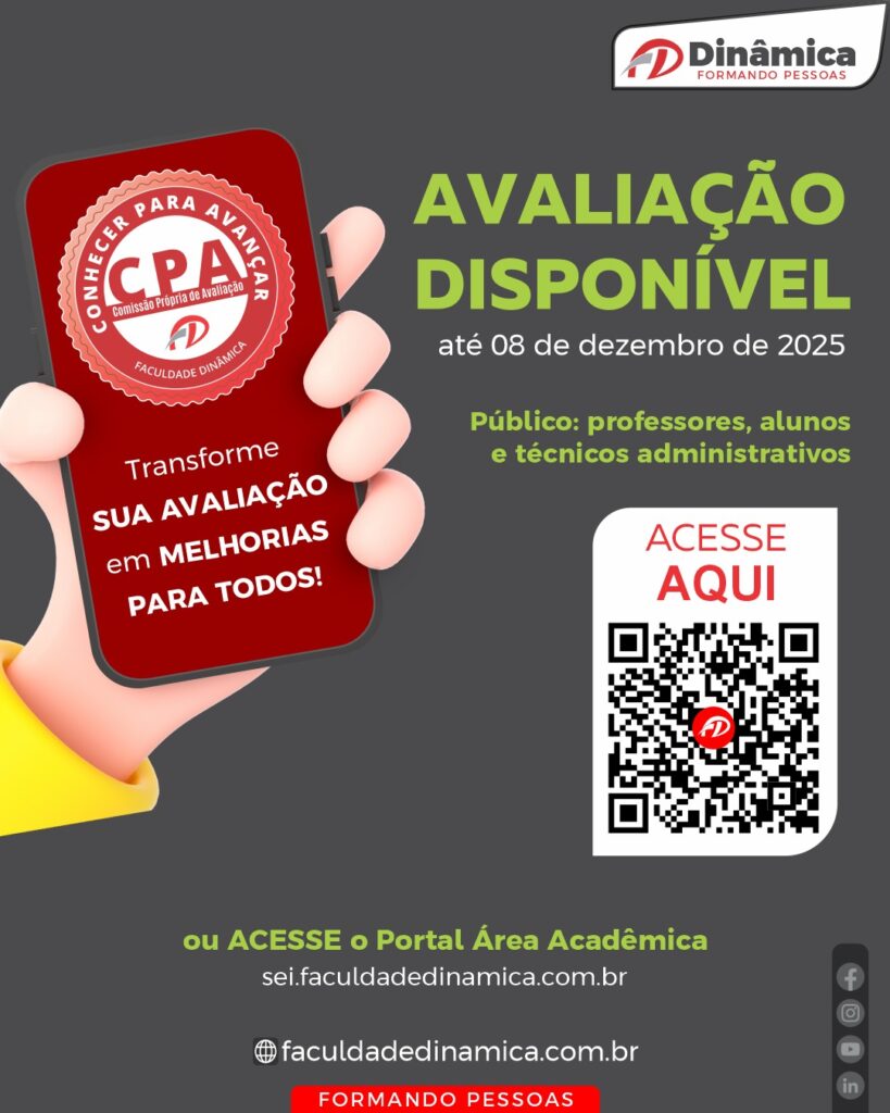 💬 Alunos, professores e colaboradores da Faculdade Dinâmica podem participar da Autoavaliação Institucional até 8 de dezembro. Acesse o sistema acadêmico SEI e responda ao questionário!