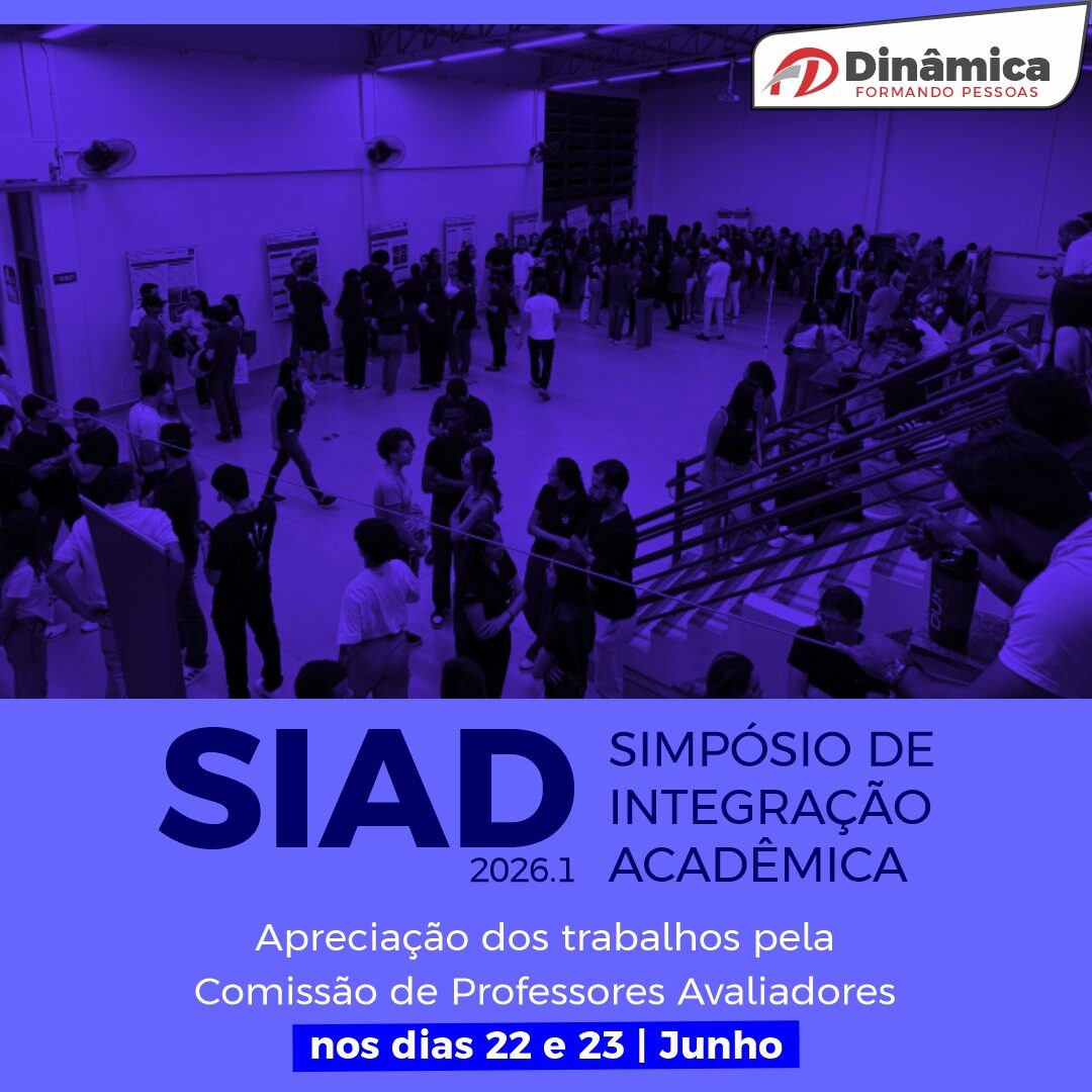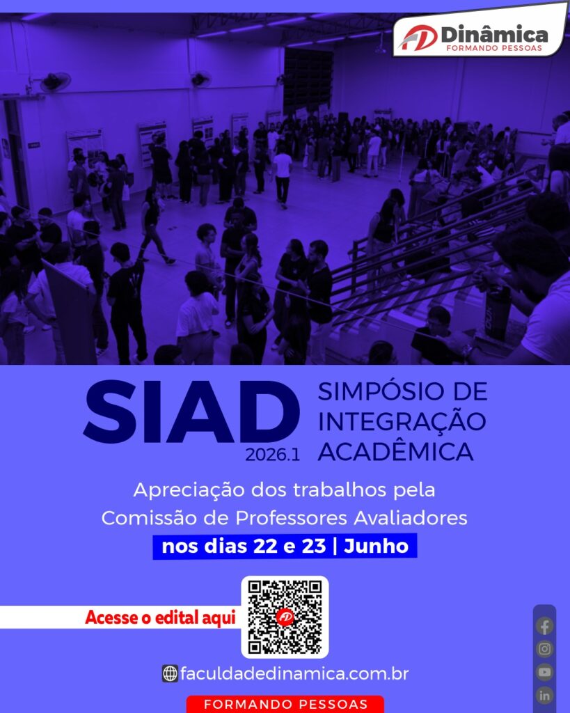 Já está disponível, no site da Faculdade Dinâmica, o edital do Simpósio de Integração Acadêmica (SIAD) do primeiro semestre de 2026. O evento é obrigatório para os alunos dos cursos de graduação matriculados na disciplina de Práticas Extensionistas.
