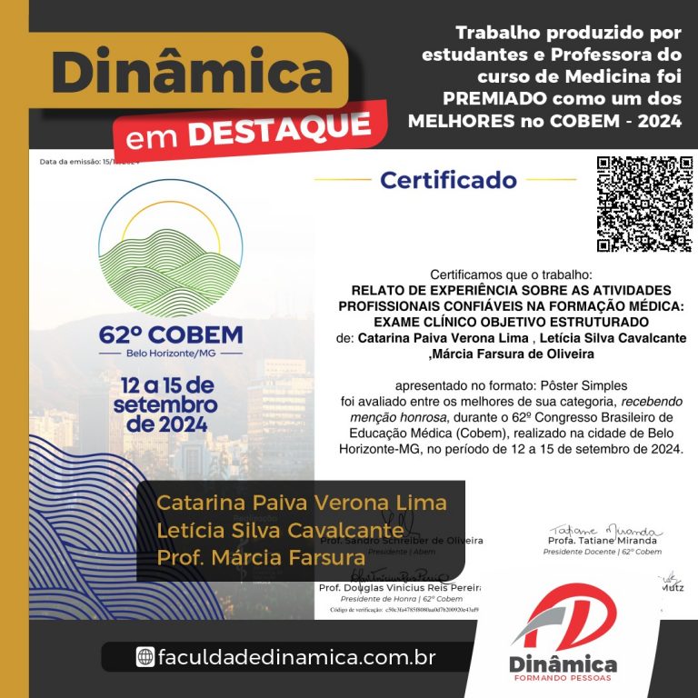 Um trabalho produzido pelas estudantes do 7º período do Curso de Medicina da Dinâmica Catarina Paiva Verona Lima e Letícia Silva Cavalcante e pela professora Márcia Farsura foi avaliado como sendo um dos melhores do 62º Congresso Brasileiro de Educação Médica (Cobem).